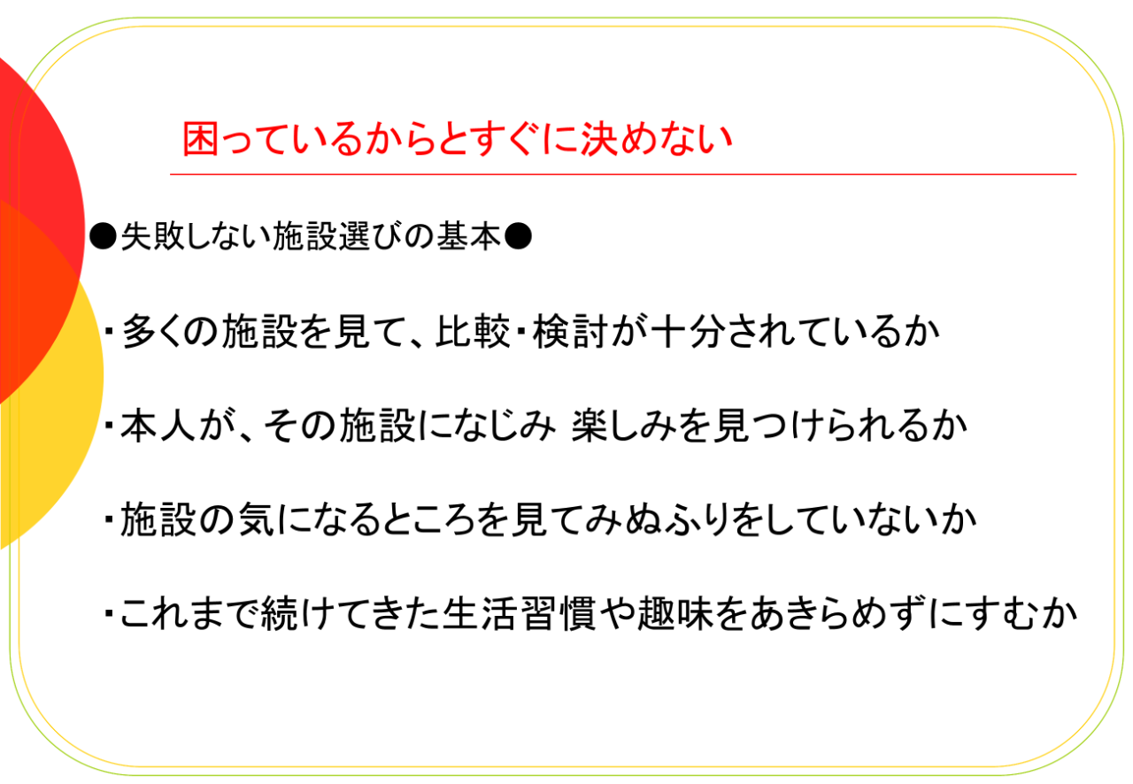 今回は、ずばり! 「失敗しない施設選びの基本」です。